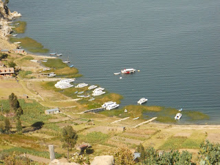 On our first day we went on a tour to see the floating islands. They are amazingly firm considering they are made of reeds. They are anchored to the bottom of the lake so they don't float away. They are about 2 meters(6 feet) thick. To make them the locals start with a base of reed roots. Then they put layers of reeds on until the island is thick enough. After that we went to a natural island, the second largest on the Peru side of the lake. It is about 7 kilometers long. On the island there is a huge, two storey high building full of the handicrafts the locals have made.